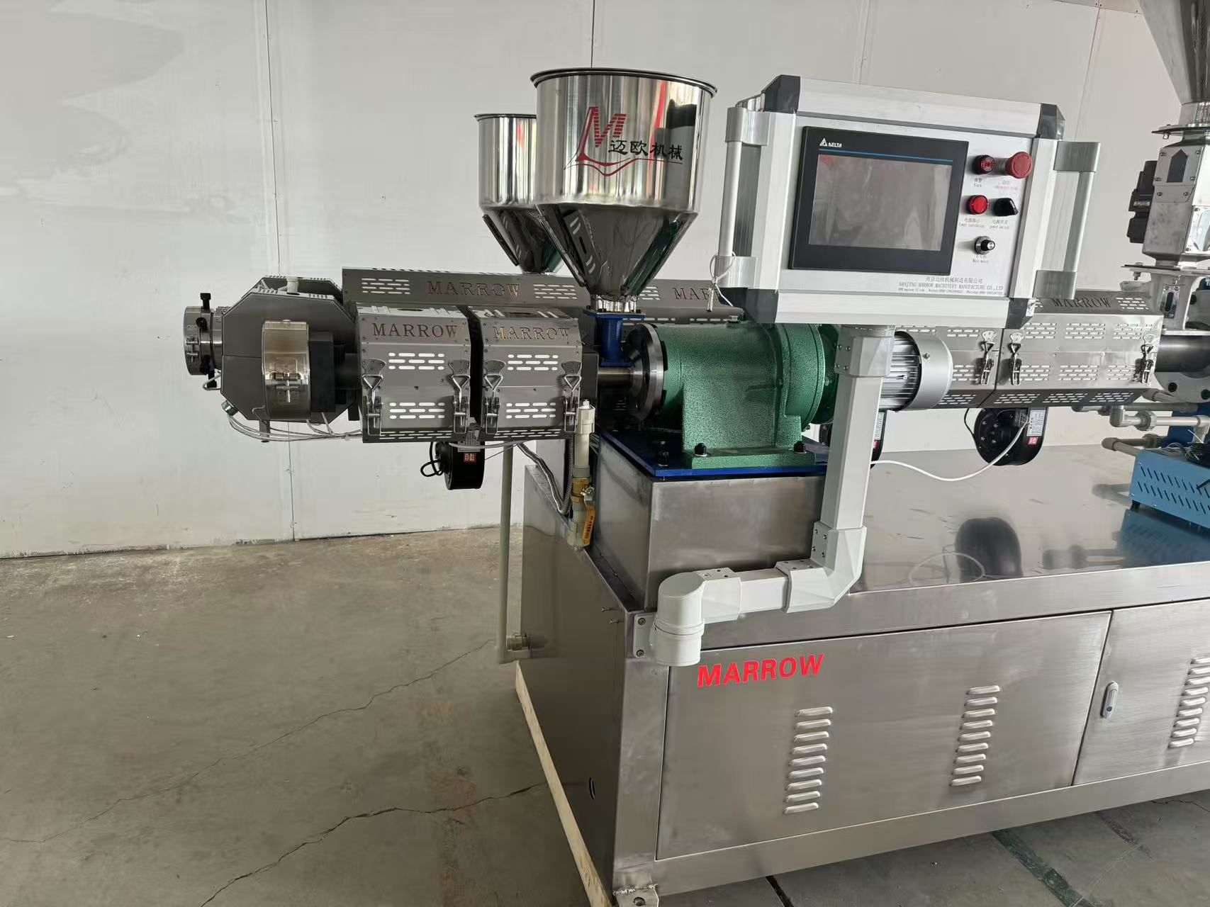 ML13-65 PLA/PLC 三色吸管擠出機組由:擠出機、機頭、冷卻定型裝置、牽引切割裝置、理管輸送裝置(選配)等部分組成,可實(shí)現:?jiǎn)紊珨D出,多色共擠等多種配置。采用全新BM分離型參數設計的PLA料專(zhuān)用65mm直徑螺桿:長(cháng)徑比33:1,塑化效果好,擠出量大,出膠穩定;采用173型硬齒面齒輪箱,30kw高效節能同步伺服電機,塑化效果好,擠出量大,出膠穩定;是生產(chǎn)PLA材料飲料吸管的專(zhuān)業(yè)設備,也可以滿(mǎn)足普通PP料吸管的生產(chǎn)。